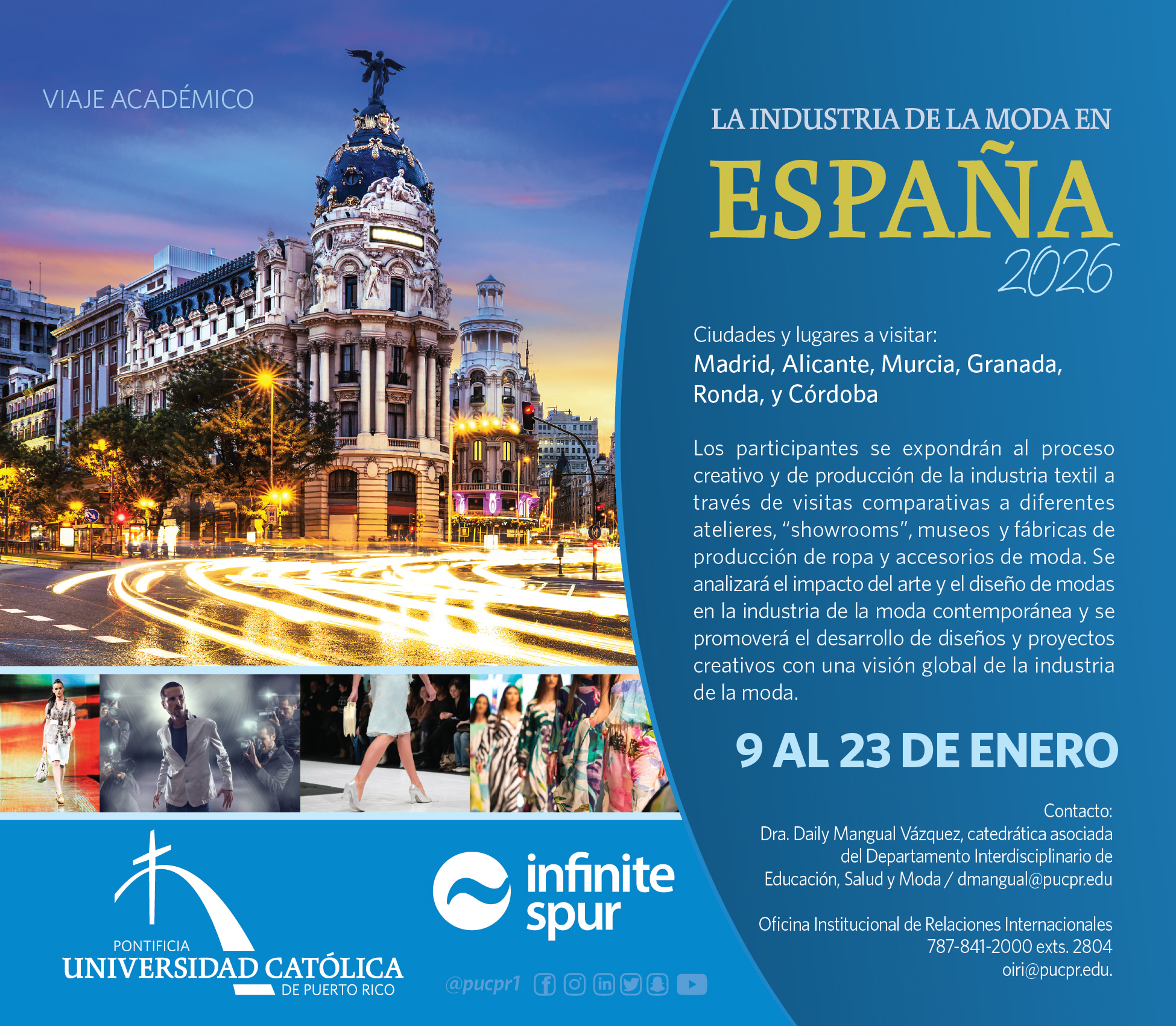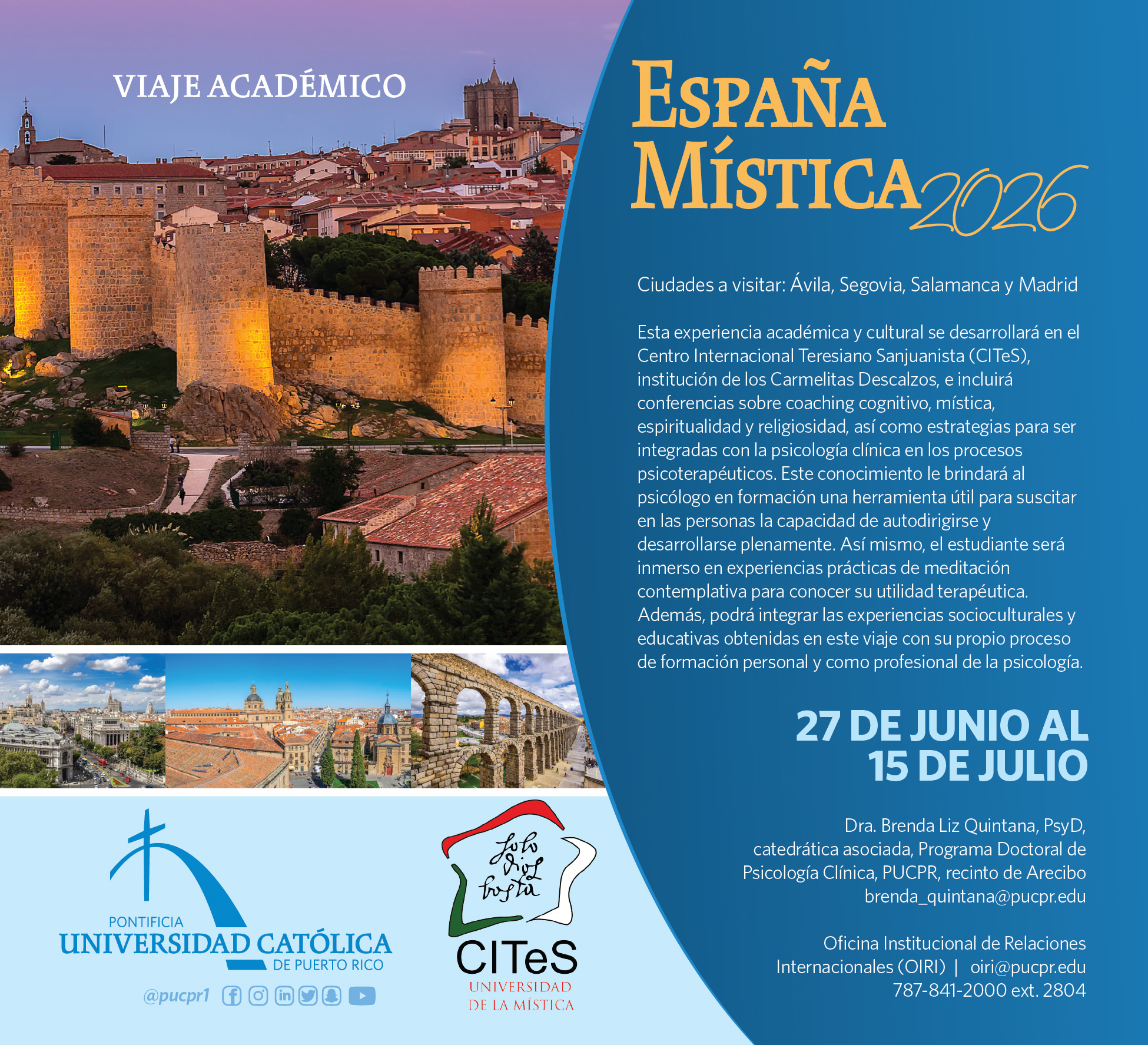 Viajes académicos 2024-2025 || Viajes académicos 2023-2024 || Viajes académicos 2022-2023 | | Viajes académicos 2019-2020 Viajes Académicos 2025-2026 Arquitectura España 2026 Diseño de Modas España 2026 España Mística 2026 Inglés Oswego 2026 Teología Grecia y España 2026 Trabajo Social Colombia 2026 Bellas Artes Disney 2026 Liderazgo en un contexto Internacional España 2026 Contacto para información de los Viajes Académicos Forma de contacto para solicitar mayor información de los Viajes Académicos Nombre y apellidos Nombre Apellidos Correo electrónico Número de teléfonoNivel y programa académico que estudiaViaje académico de interésInformación que solicita